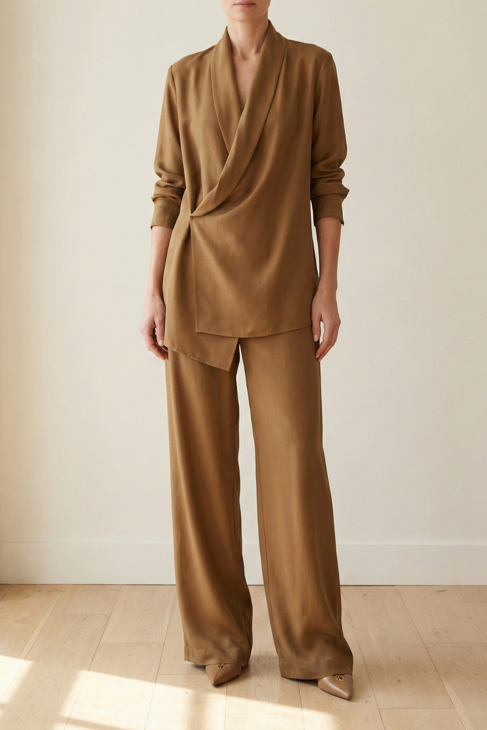 Notre Camille – Ensemble chemise et pantalon structuré est confectionné dans une matière fluide et soyeuse.